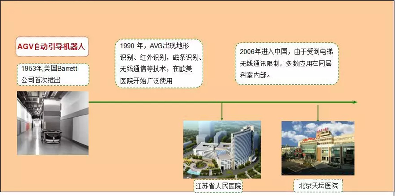 自动导引车系统最早出现在20世纪50年代,70年代开始在欧美、日本等发达国家推广应用。自动导引车系统最初应用在工业领域,后进入医院领域,用于解决医院内大宗物资输送问题。