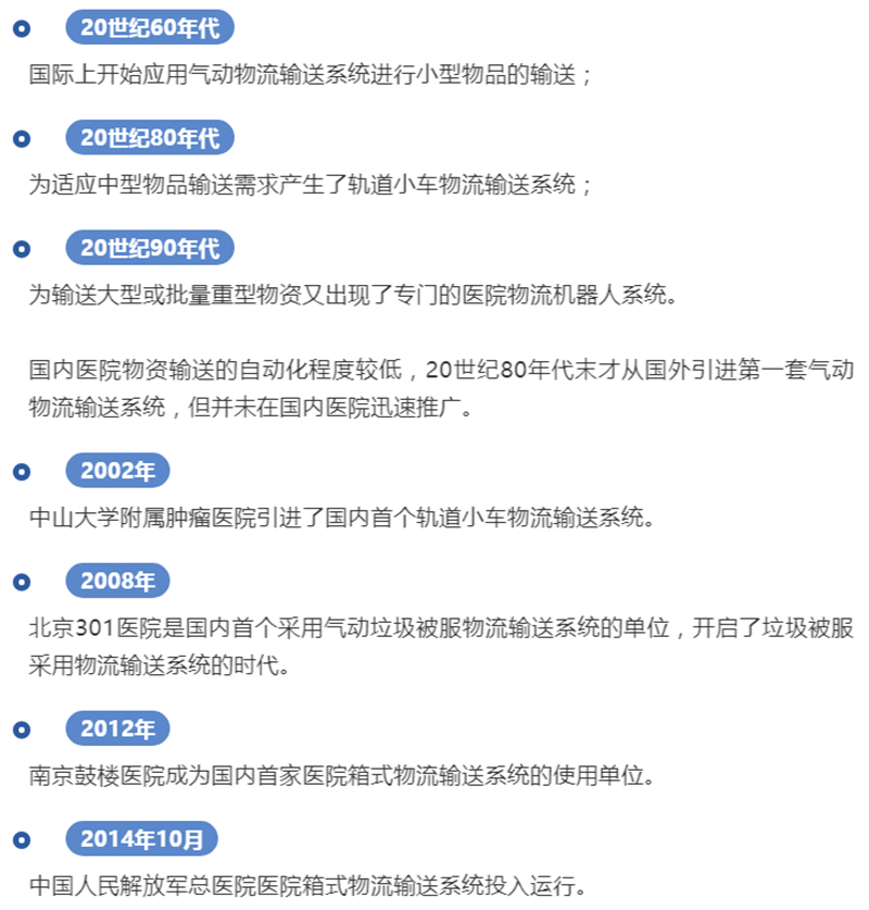 20世纪80年代末,深圳市人民医院从国外引入气动物流体系,开启我国医疗机构建设智能物流系统的征程。由于技术、人员等诸多问题尚未完全解决,智能物流系统目前在我国医院中的使用比例仍然较低,应用的产品种类和配送物资的范围也较为单一和狭窄。