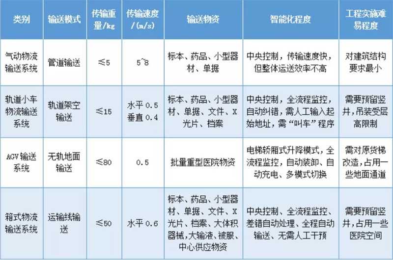 医院物流现代化是现代化大型医院的必然需求,各种物流输送系统也各有优缺点(表1)。