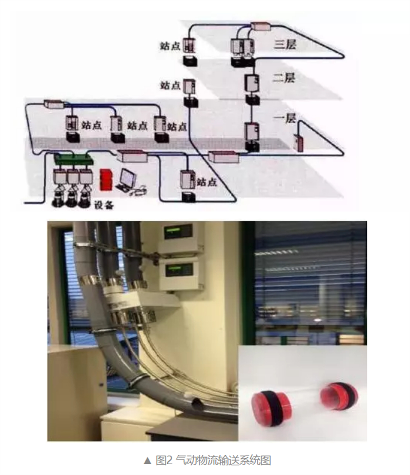 医用气动物流传输系统一般由收发工作站、管道换向器、风向切换器、传输瓶、物流管道、空气压缩机、中心控制设备、控制网络等设备构成。图2为某医院的气动物流输送系统图。