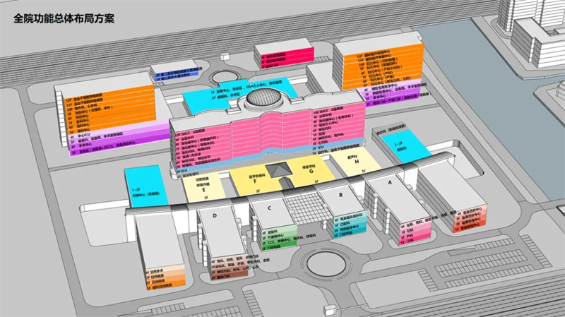 首先,通过现场踏勘调研了解项目一期的运营情况及面临的问题,同时针对一期现有存量及腾挪情况进行盘整。结合具体现状问题加以分析,并采用以“增量带动存量”的整体设计思路,提升优势学科,梳理整个院区的功能布局、医疗流程、医患流线、洁污流线、物流体系以及地下空间利用等进行统筹考虑和整体设计。