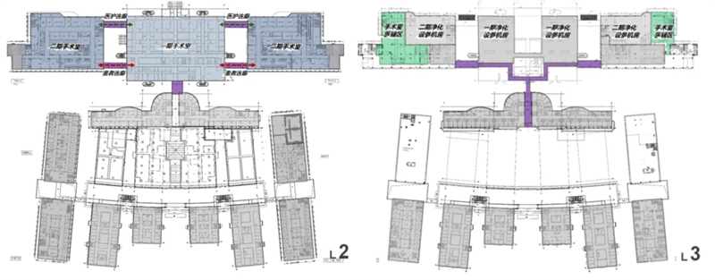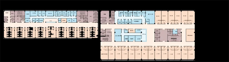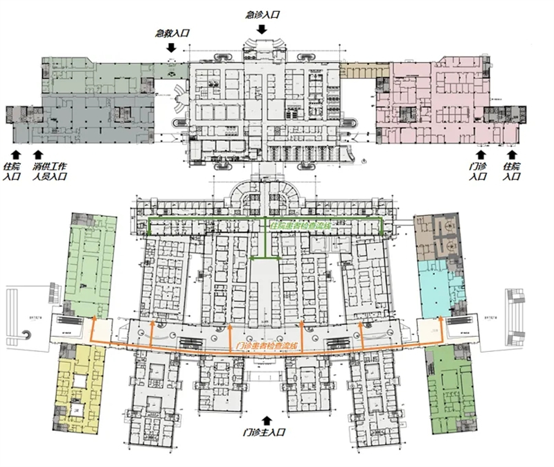 在工艺方案设计阶段,将医疗需求转化为建筑需求,明确建筑内外部交通组织、内部核心筒设计、护理单元选型等重要环节。设计过程中,充分尊重建筑的可生长式布局模式,并延续原有的规划理念。同时,通过详尽梳理,将一期功能板块中的缺失和不合理流线、功能规划,在二期建设中,进行必要的流程再造,以完善和优化功能布局。