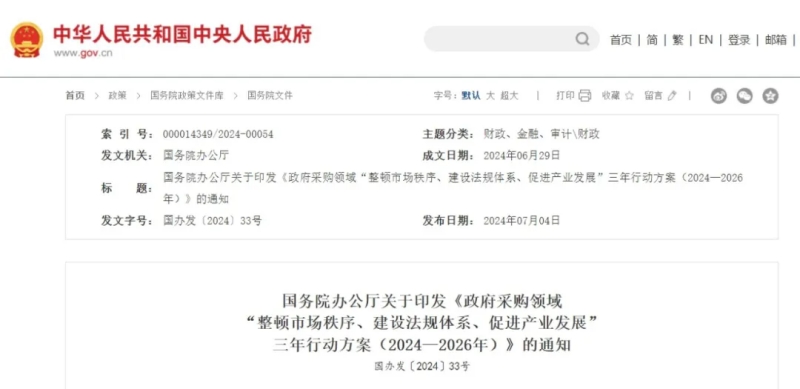 日前,国务院办公厅印发《政府采购领域“整顿市场秩序、建设法规体系、促进产业发展”三年行动方案(2024-2026年)》(以下简称《行动方案》)。