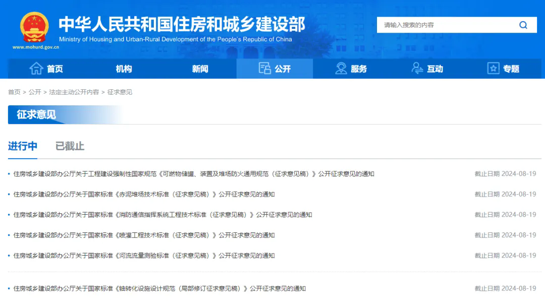近日,住房城乡建设部就1项工程建设强制性国家规范和5项国家标准公开征求意见,意见反馈截止时间为2024年8月19日
